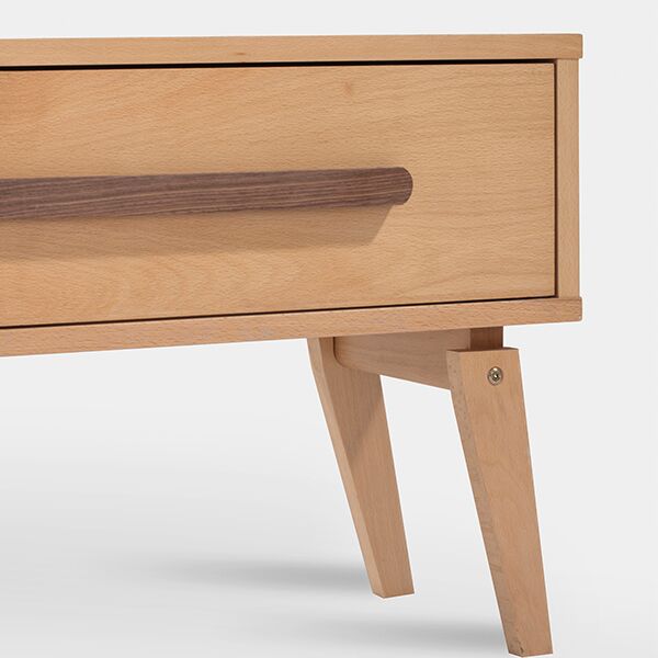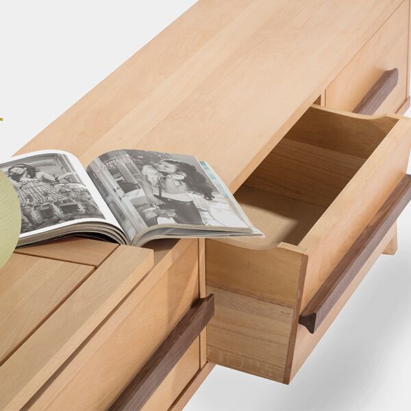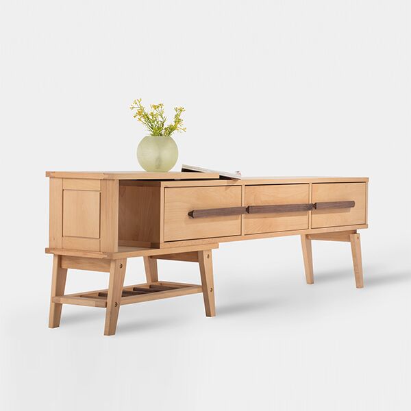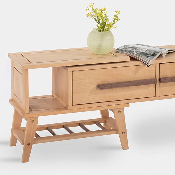 This modern TV stand offers elegant storage and display space for your entertainment area. Crafted from solid beech wood, it provides lasting durability and a natural aesthetic. Designed with stability through splayed legs, it comfortably accommodates large televisions and helps organize media components and decor.