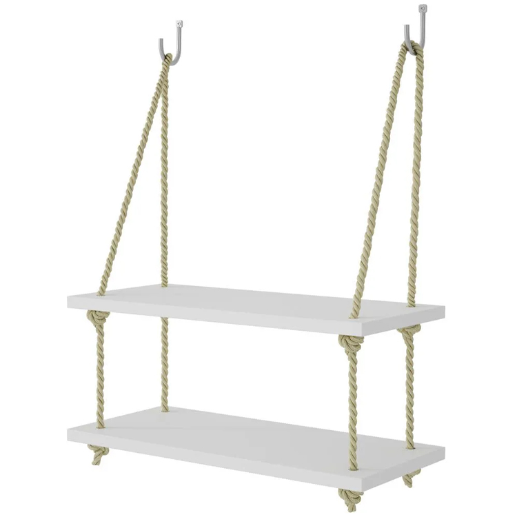 Stylish dual-level wall shelf with natural sisal rope accents and hooks. Perfect for storing plants, spices, and decor in kitchens or living rooms. Water-resistant, scratch-proof, and space-saving.