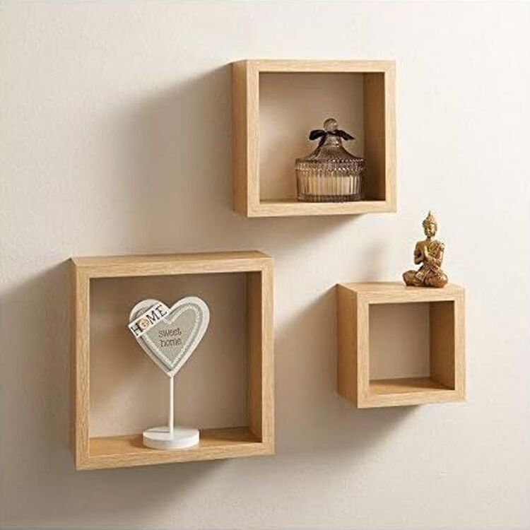 Set of three modern floating cube wall shelves with hidden brackets. Made from durable MDF and PVC in white finish. Ideal for stylish storage and decor in bedrooms, kitchens, or living rooms. Easy to install and maintain.