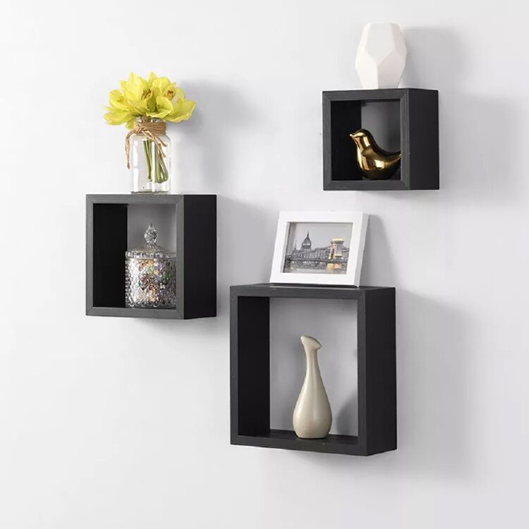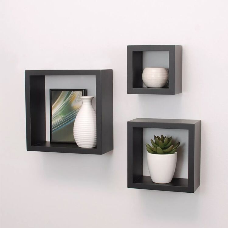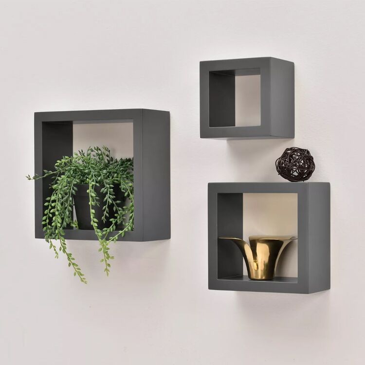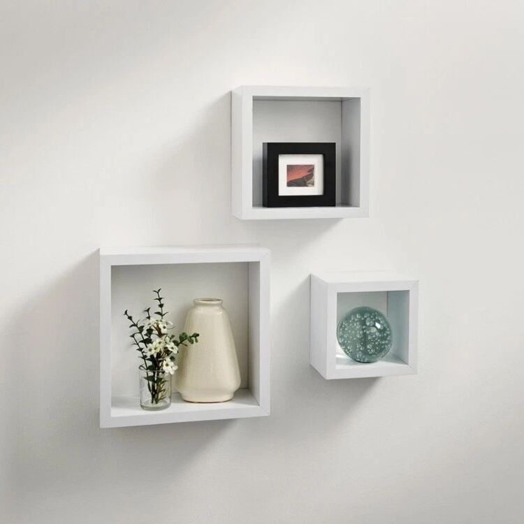 A set of three modern cube-shaped floating wall shelves designed for contemporary interiors. These sleek shelves offer versatile storage and display solutions, featuring a smooth white finish and durable construction. Ideal for organizing essentials or showcasing decor in spaces like bedrooms, living rooms, and kitchens.