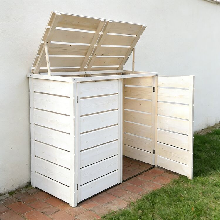 This double wooden wheelie bin store is a stylish and durable outdoor solution for concealing trash or recycling bins. Made from treated timber or solid wood, it holds two standard wheelie bins up to 240 liters each. Its slatted design ensures airflow to reduce odors, while top-hinged lids and front doors provide easy access. Perfect for gardens, patios, driveways, or commercial outdoor areas, it combines functionality with aesthetic appeal.