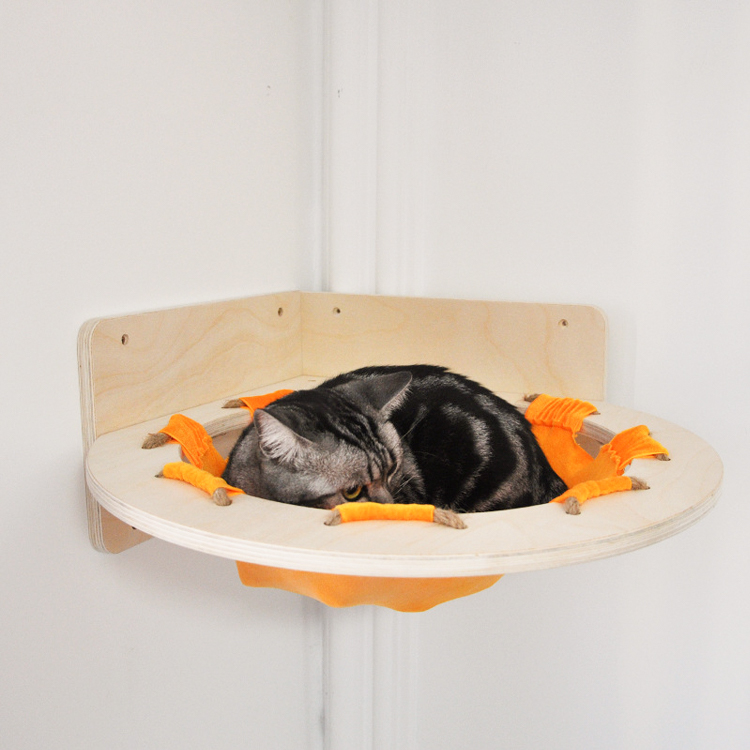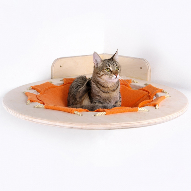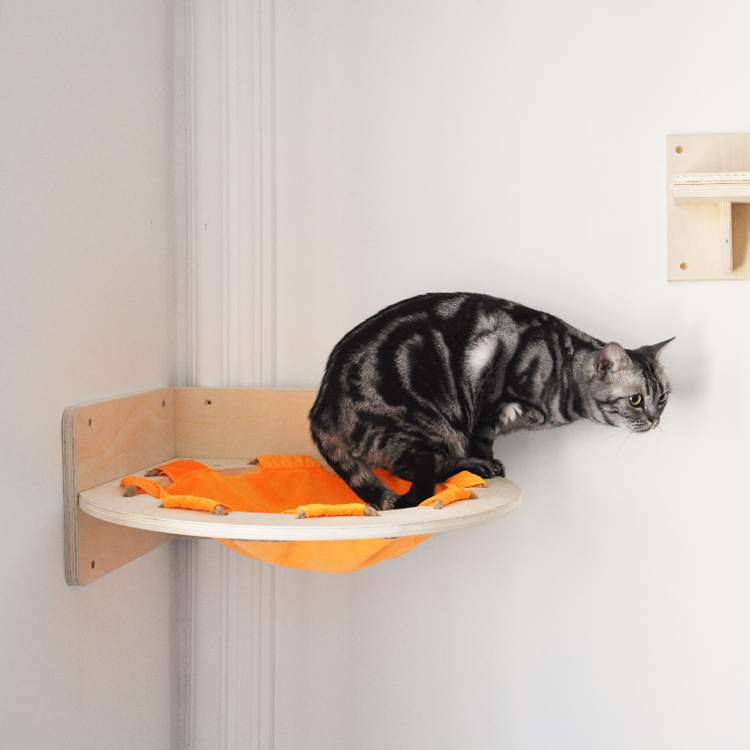 The Round Wood Wall Mounted Cat Hammock is a space-saving wall-mounted cat bed designed for modern homes. Made with a solid wood frame and a round fabric hammock, it provides cats with a comfortable elevated resting spot while freeing up floor space. The round shape creates a secure lounging area that supports a cat’s natural instinct to perch and observe from above. Suitable for residential use and modular cat wall systems.