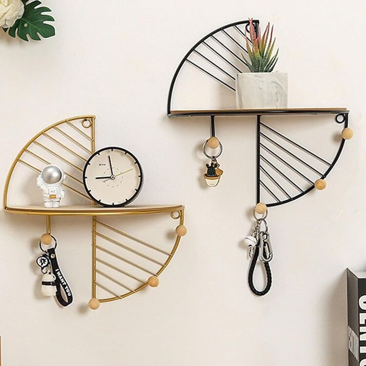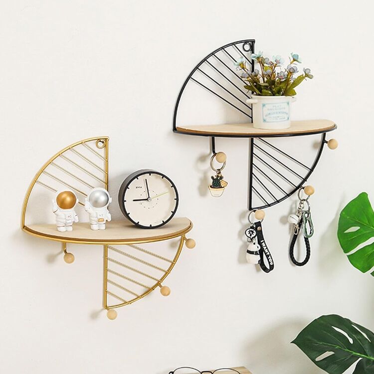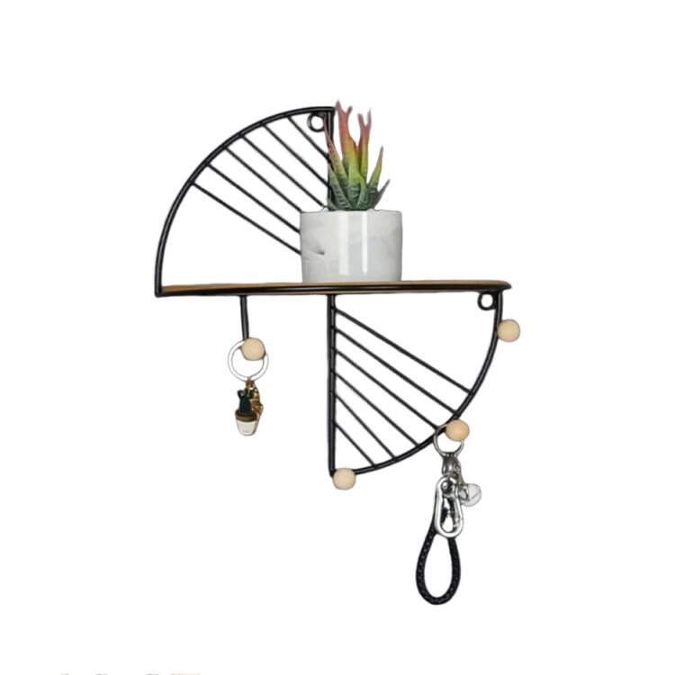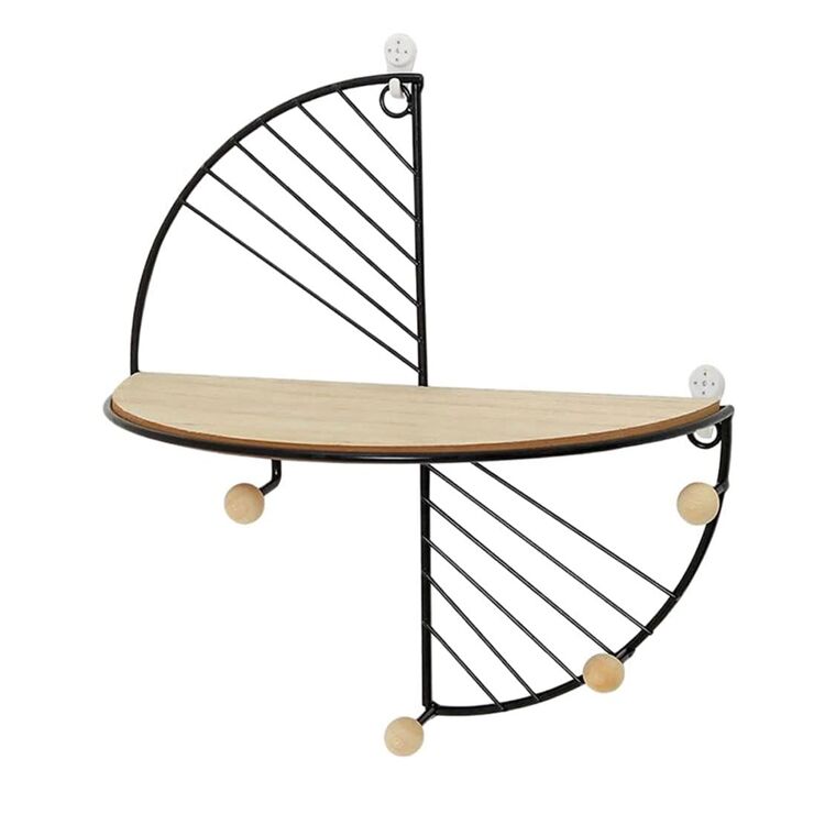 A semicircle floating wall shelf blending rustic wood and metal design. Features iron hooks, space-saving storage, and modern versatility for living rooms, kitchens, or bathrooms. Easy to install and durable.