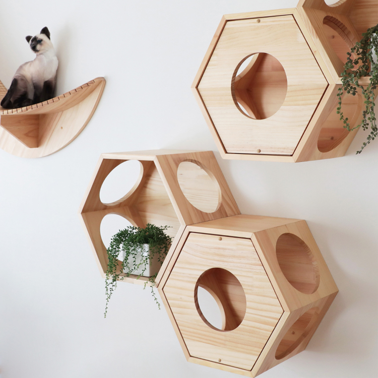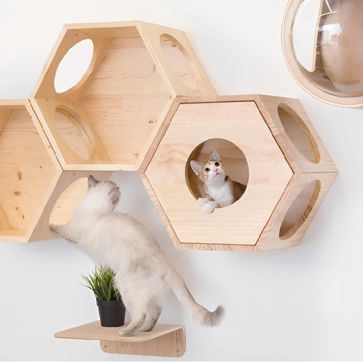 This wood hexagon wall-mounted cat shelf offers a modern, space-saving solution for indoor cats. Its modular design allows multiple units to be connected, creating a customizable climbing and lounging area. Made from durable wood with a non-toxic finish, it provides a safe and stylish place for cats to hide, play, and observe from a height.