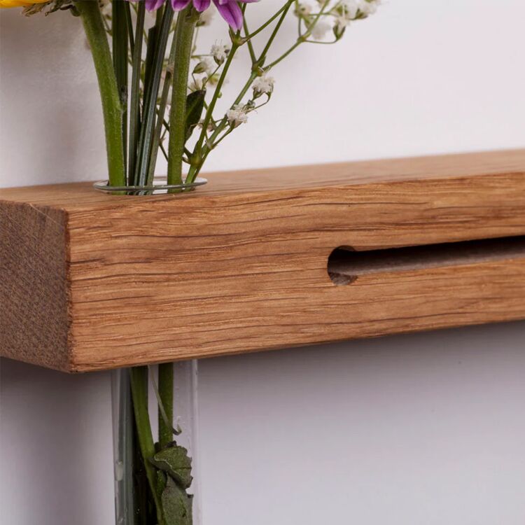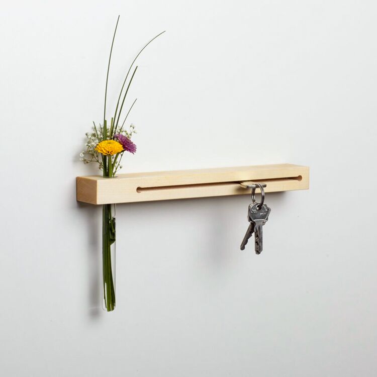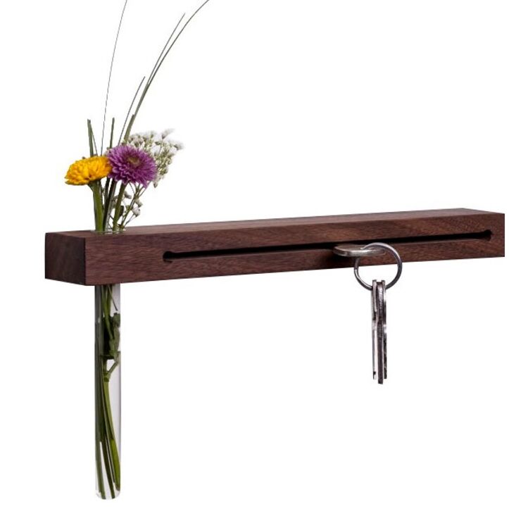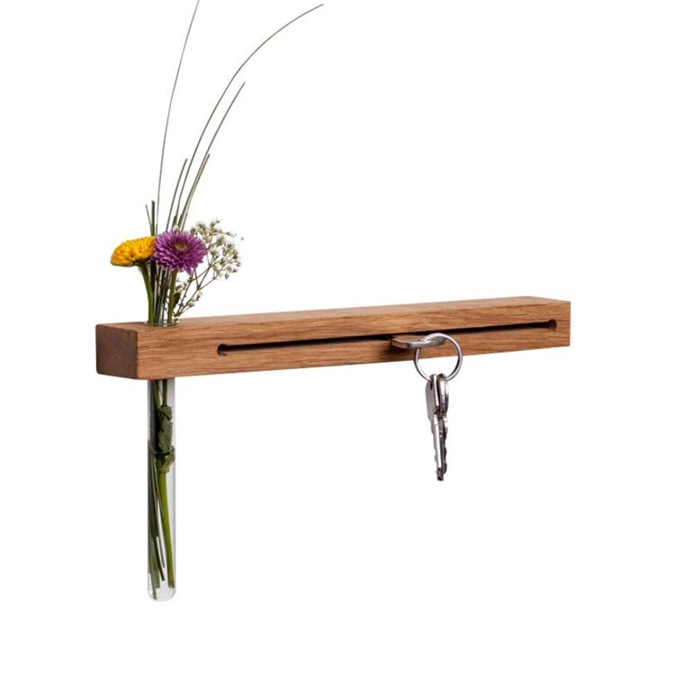 A rustic wall-mounted key holder combined with a flower vase, crafted from solid wood. Features multiple hooks, a glass vase for fresh blooms, and a shelf for small essentials.